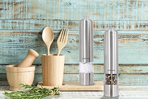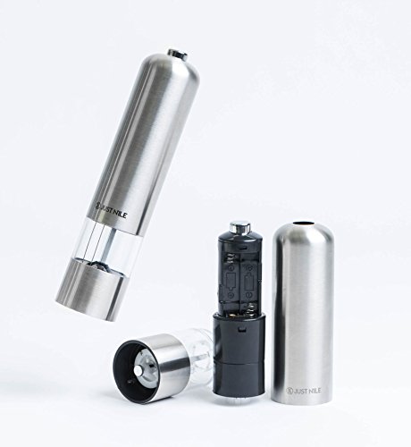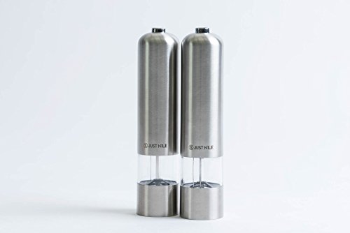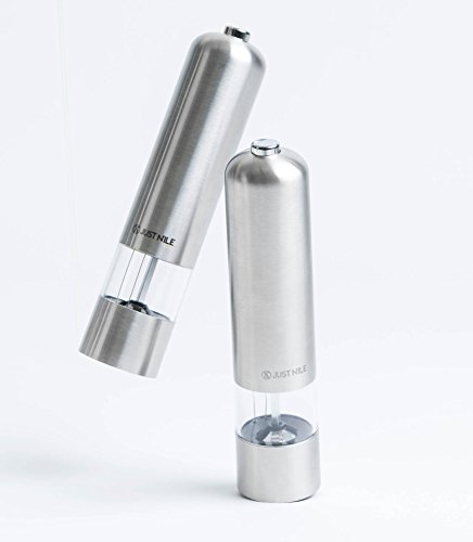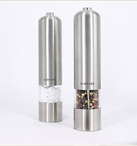 JustNile Electric Battery Operated Stainless Steel Salt and Pepper Mill Set (Pack of 2) with Ceramic Grind & LED Light, Adjustable Coarseness; Electronic Automatic Spices & Grains Grinder with Brushed
