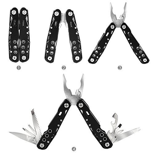 - MULTI-FUNCTION KIT: Combination of spring-loaded pliers, wire cutter/stripper, small knife, nail file and saw, bottle and can opener, small flat-head screwdriver / large flat-head screwdriver.