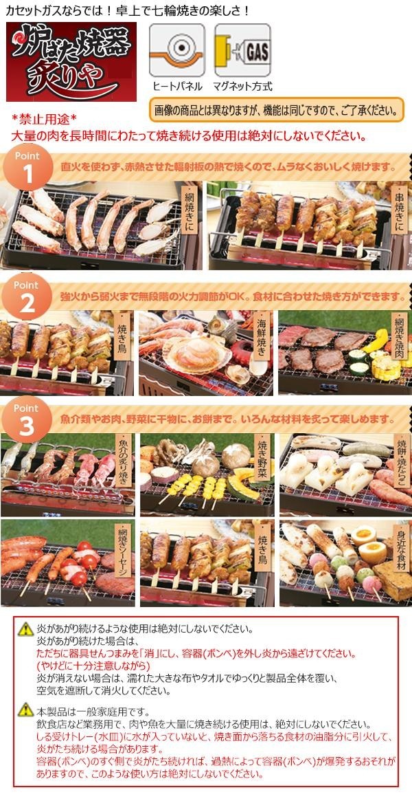 ご自宅で簡単に七輪のようなあぶり焼きや炉端焼きが楽しめます。網を外して、ステーを立てれば串焼きも♪強火から弱火まで無段階の火力調整が可能なので、食材に合わせた焼き方ができます。 |
