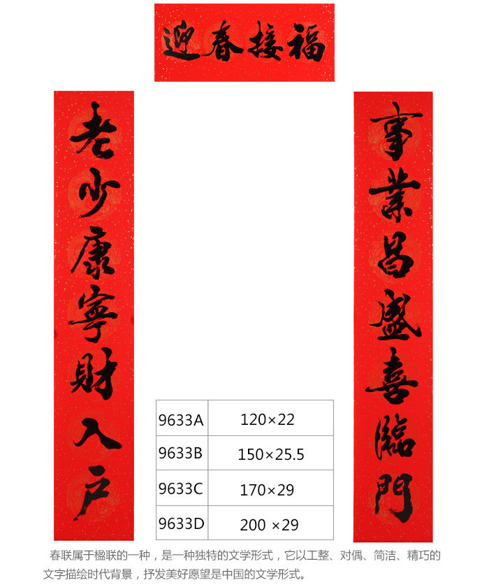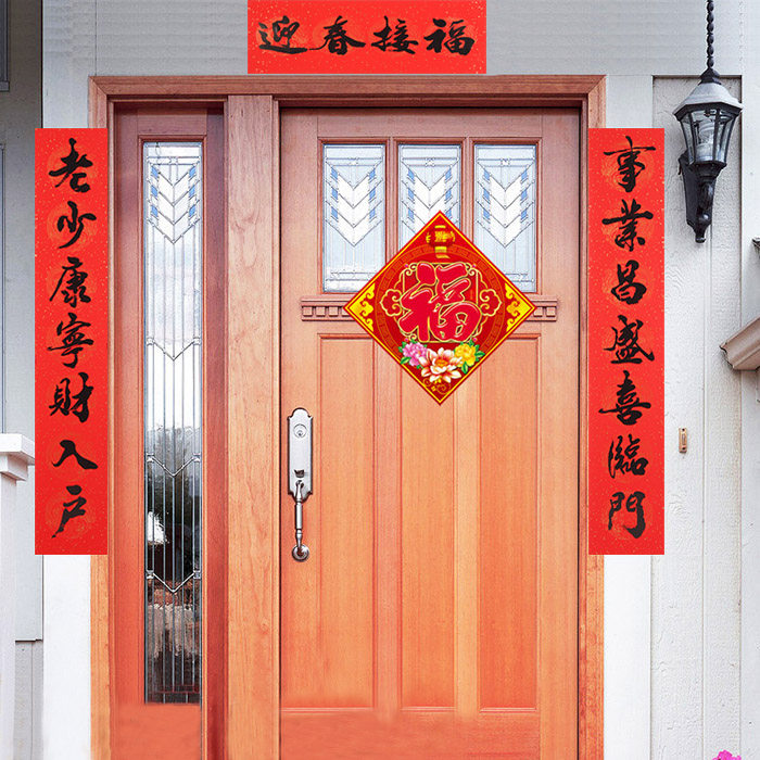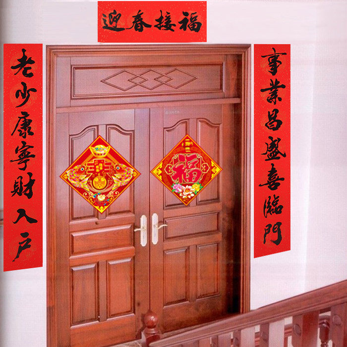 Spring paste couplets, beautiful appearance of the atmosphere of this beautiful couplets, meaning beautiful. Can play in the home stickers entrance doors of the town house evil fortune role, if the "feng shui door blessing" at the same time use, the effect is even more powerful. Couplets, also called "door to," "Spring stick", "couplet", "pair", it neat, duality, simple, sophisticated text depicting the historical background, to express good wishes, a literary form unique to China. Originated in the Spring Festival (Zhou hung mahogany doors on both sides of the rectangular plate). Couplets, are Chinese "Spring Festival," the main logo. When people in their own doorstep labeled "couplets", it means "Spring Festival" kicked off. Every New Year, whether urban or rural, every household featured a pair of red couplets posted on the door, the increase for the holiday festive atmosphere.