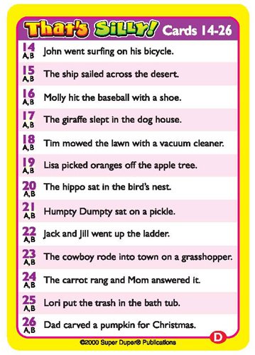 -. Binding : Toy -. Brand : Super Duper® Publications -. EAN : 9781586501853 -. Feature : 56 illustrated cards (2 1/2" x 3 1/2") - 26 pairs of sentences with absurd situations to correct / Includes storage tin, card index, bonus cards, and game ideas / Educational - Helps children improve their receptive and expressive communication skills / Over 30 Super Duper Publications Apps available on the Amazon Appstore for Android / You might also enjoy our What's Wacky? Fun Deck Cards - also featured on Amazon -. ISBN : 1586501852 -. Label : Super Duper® Publications -. Manufacturer : Super Duper® Publications -. MPN : FD-29 -. PackageQuantity : 1 -. PartNumber : FD-29 -. ProductGroup : Toy -. ProductTypeName : TOYS_AND_GAMES -. Publisher : Super Duper® Publications -. Studio : Super Duper® Publications -. Title : That's Silly! Fun Deck Cards - Super Duper Educational Learning Toy for Kids