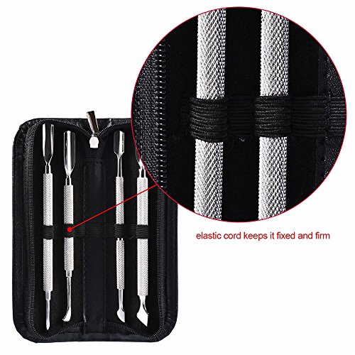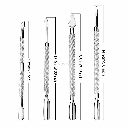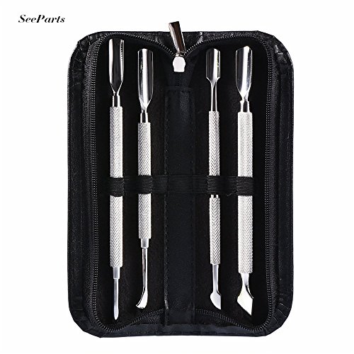 - SeeParts 4 pieces manicure pusher stainless steel cuticle pusher double ended nail remover cleaner kit with black PU bag 4 In 1 nail remover kit: