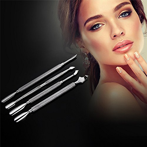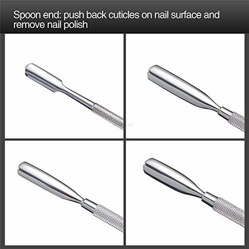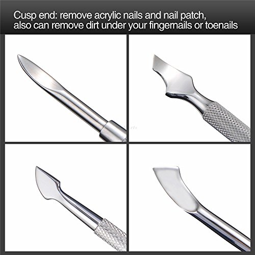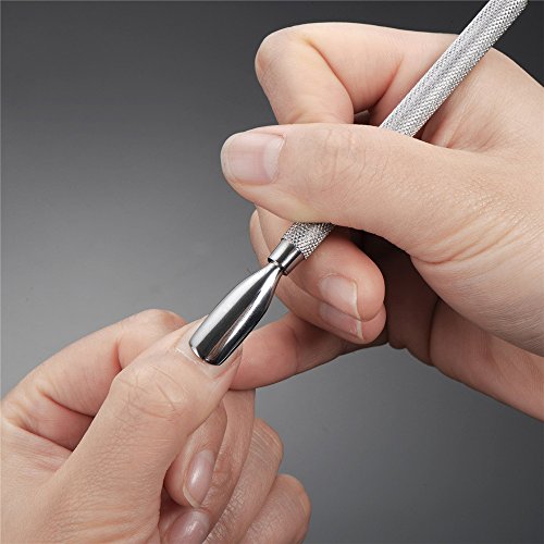 - Stainless steel manicure pushers fit for pushing excess skin, scraping acrylic or nail glue off the nail plate, removing pterygium and cleaning under fingernails and toenails.