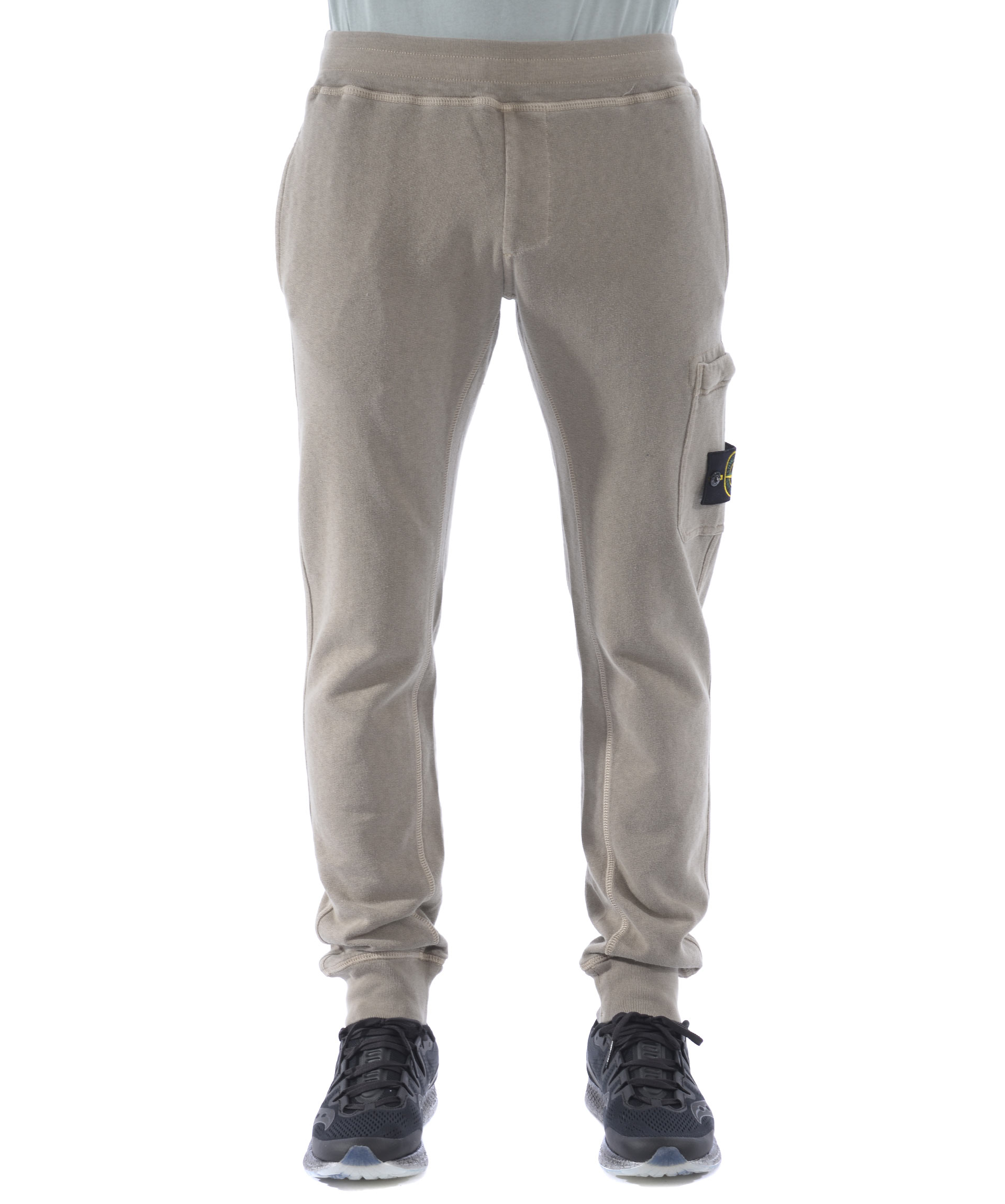 Pantaloni jogging Stone Island in cotone malfilè Beige. Trattamento effetto old. Elastico in vita con coulisse interna. Tasche frontali a filo. Tascone sulla gamba con zip e patch logo removibile. Tasca posteriore con bottone. Elastico al fondo.