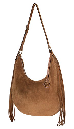 -. Feature : SUEDE LEATHER, GOLD TONE HARDWARE, , ADJUSTABLE STUDDED SHOULDER STRAP.Top zipper closure Long Fringe on both Sides Interior has one inside zipper pocket and 4 slip pockets Approximate measurements: 15" (L) x 16" / 10.5" (H) x 3.5"