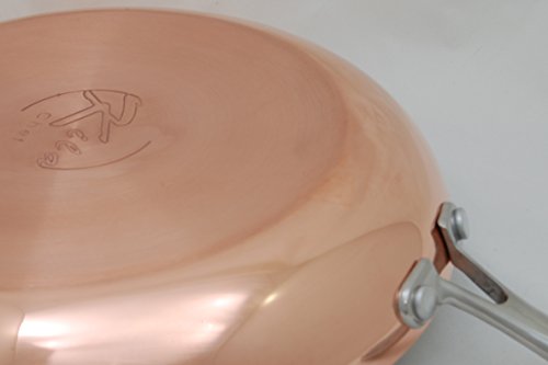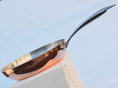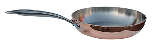 The highlight of our frying pan is the 3.5 mm thickness. The copper exterior is 1.5 mm, the aluminum core is 1.5mm, and the stainless steel interior is 0.5mm. Home chefs that love conduction in their pan will cherish this everyday use item. The aluminum core is a good compromise (over copper ore). This pan will heat quickly on the stove but also cool fast to prevent burning. The 9.4-inch frying pan excels in browning meats and for sauteing vegetables. Our pan has a 2" sloped side for easy stirring. The classic elegance of the copper bottom will tarnish into a heirloom tarnished patina that has been cherished by mankind for ages. Brighten up your life with the glow of copper.. The stainless surface interior is easy to clean and is neutral. This pan requires very little oil and promotes healthy cooking. Delicious gourmet entrees promote small helpings and cut down on caloric intake. The pan cleans easily. Ergonomic riveted handles allow for robust use.Feature