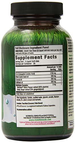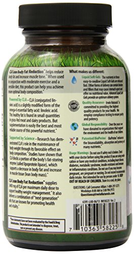 -. Binding : Health and Beauty -. Brand : Irwin Naturals -. EAN : 0710363582258 -. Feature : Research has demonstrated CLA's role in the maintenance of body weight through its favorable effect on body composition / Studies have shown that CLA blocks a portion of the body's fat-storing enzyme (called lipoprotein lipase), which supports a decrease in body fat and increase in muscle tissue (lean body mass) / CLA Lean Body Fat Reduction supplies 3400 mg of CLA per maximum daily dose to support healthy weight management / It also delivers a combination of next generation oils that are known for promoting health and vitality / Easy to swallow liquid soft gels for fast and efficient delivery -. IsAdultProduct : 0 -. Label : Irwin Naturals -. Manufacturer : Irwin Naturals -. MPN : 710363582258 -. NumberOfItems : 1 -. PackageQuantity : 1 -. PartNumber : 710363582258 -. ProductGroup : Health and Beauty -. ProductTypeName : HEALTH_PERSONAL_CARE -. PublicationDate : 2014-11-08 -. Publisher : Irwin Naturals -. ReleaseDate : 2015-07-16 -. Size : 80 -. Studio : Irwin Naturals -. Title : Irwin Naturals C.l.A. Lean Body Fat Reduction Supplement, 80 Count -. UPC : 710363582258