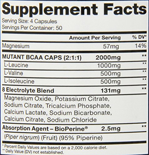 Mutant BCAA caps deliver 2000 mg of 100% free form BCAAs per dose in the preferred 2:1:1 ratio. Plus we've kept intact the vital mineral electrolytes and the patented absorption agent BioPerine that we also use in our Mutant BCAA 9.7 powder.