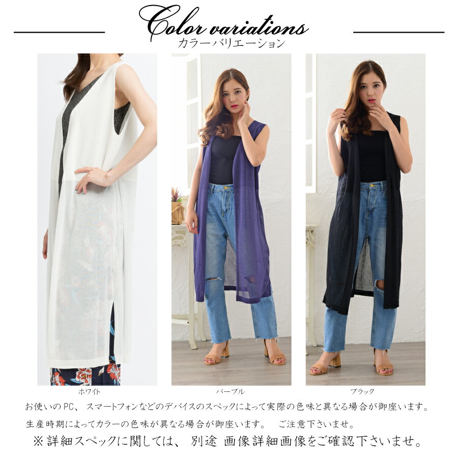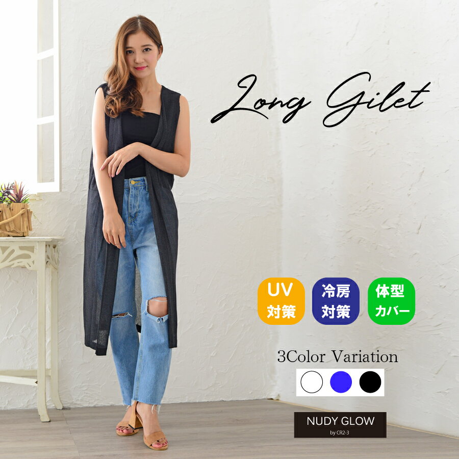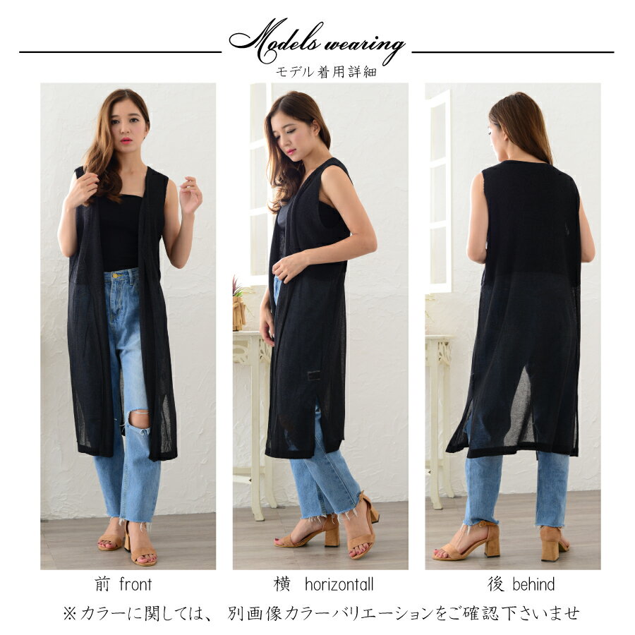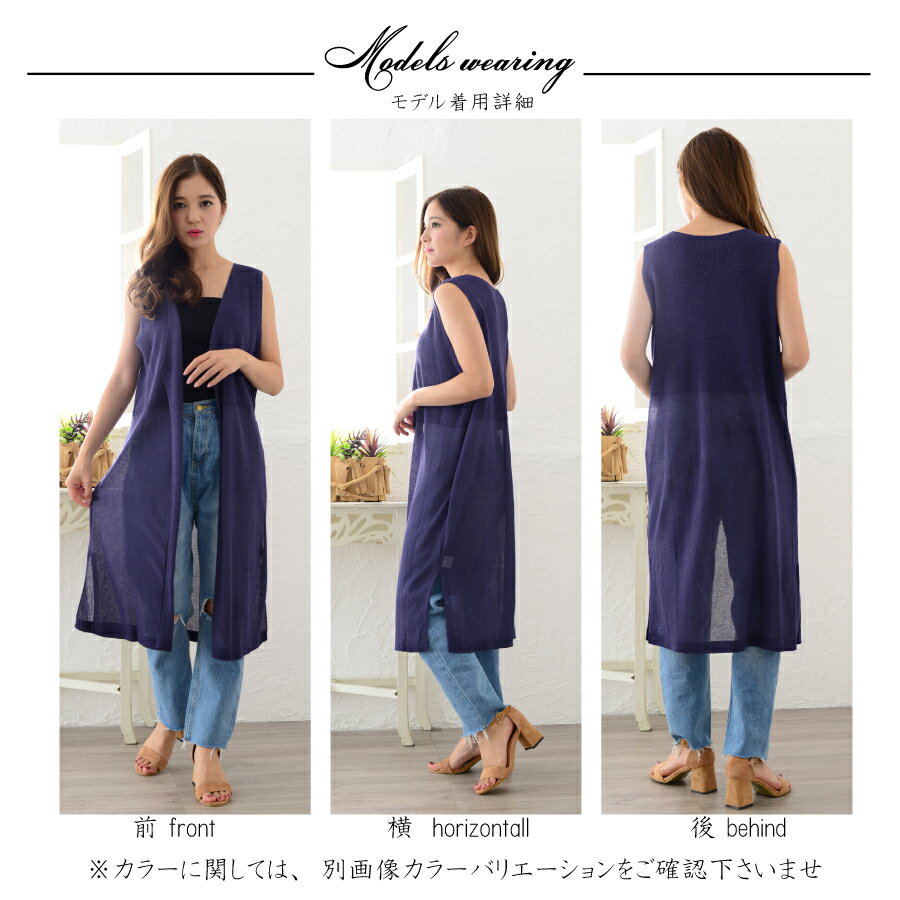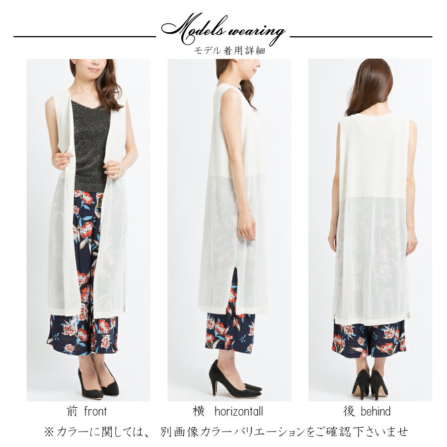 異なるゲージで編んでデザイン性があるニットのロングジレです。 シャリ感がある糸なので清涼感がありしわになりにくいです。
