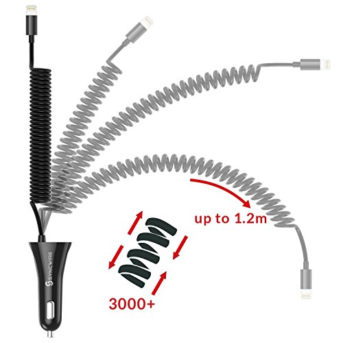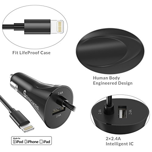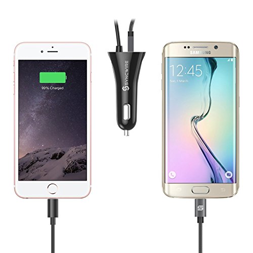 - i-Smart Design - The combination of lightning cable and additional USB port allows Syncwire lightning car charger charge any two devices simultaneously with max up to 4.8A output, and it automatically adapts the output to each one accordingly.