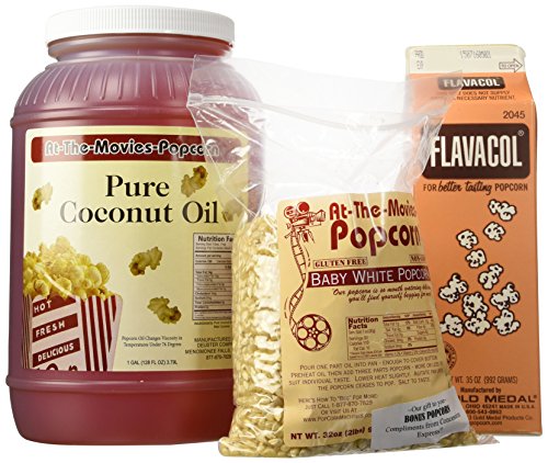 -. Binding : Grocery -. Brand : At The Movies -. Feature : Gallon of White coconut oil for popping popcorn / For great tasting At-The-Movie taste / Includes 35oz container of Flavocol / No trans fats / No refrigeration required; weighs 8.25 pounds -. IsAdultProduct : 0 -. ProductGroup : Grocery -. ProductTypeName : GROCERY -. Title : Coconut Popcorn Popping Oil (Gallon) & Flavocol Combo