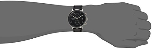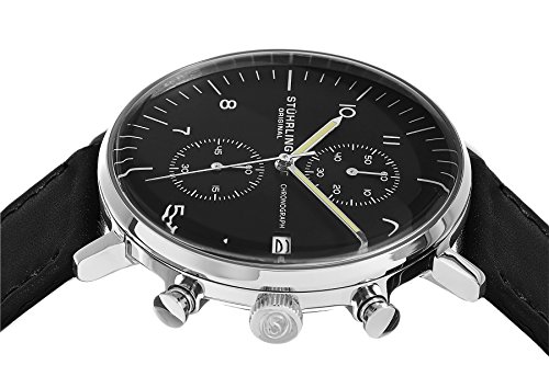 Round watch featuring black dial with chronograph, date window at 3 o'clock and luminous hands