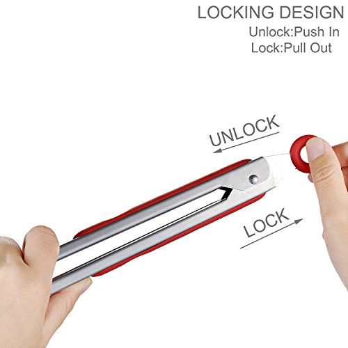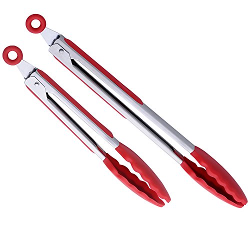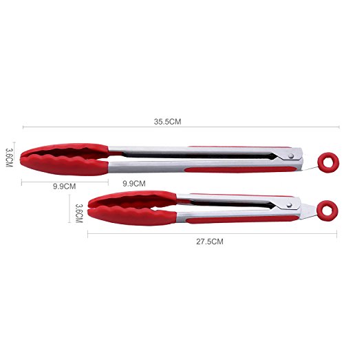 Danslesbls Heavy Duty Nonstick Silicone Kitchen Serving Tongs, 2 Pack 9 Inch and 12 Inch Heat Resistant Locking Food Tong with Silicone Tips (Red)