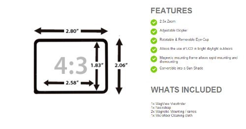 Small in price, but big in features. The MagView 4:3 LCD View Finder is one of our most affordable LCD ViewFinders for Mirrorless Cameras! The MagView View Finder will magnify your lcd screen image by 2.5x so that you can easily focus on your subject, and will also offer a true view of your image when working outdoors in bright daylight. An adjustable diopter ring moves the primary lens forward or back if your image does not appear focused. This is especially helpful for those who have less than perfect vision. Features: 1) 2.5x Zoom 2) Adjustable Diopter 3) Rotatable & Removable Eye-Cup 4) Allows the use of LCD in bright daylight outdoors 5) Magnetic mounting frame allows rapid mounting and dismounting 6) Convertible into a Sun Shade What is included: 1x MagView Viewfinder 1x Neckstrap 2x Magnetic Mounting Frames 1x Microfiber Cleaning cloth NOTE: On the back of the camera is where the included self adhesive magnetic mounting frame attaches to the glass area. The glass area consists of two sections that need to be measured. The first is the OD (Outside dimension) of the glass. The second is the ID (Internal Dimension) of the actual view-able area, the display. To choose a MagView Viewfinder that best fits your camera, we recommend taking a few minutes to measure the the two sections of the glass on the back of the camera. 14-day Money Back Guarantee! 1 Year Manufacture Warranty!Feature