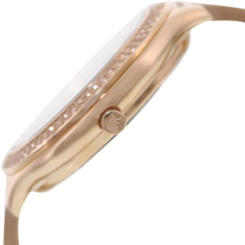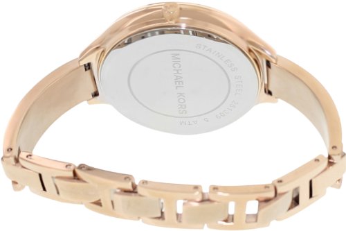 Pink gold-tone stainless steel case with a pink gold-tone stainless steel strap set with crystals. Fixed pink gold-tone bezel set with crystals. Pink crystal-set dial with rose gold-tone hands and index hour markers. Dial Type: Analog. Quartz movement. Scratch resistant mineral crystal. Pull / push crown. Solid case back. Case diameter: 43 mm. Case thickness: 10 mm. Round case shape. Band width: 12 mm. Jewelry clasp. Water resistant at 50 meters / 165 feet. Functions: hour, minute, second. Casual watch style. Michael Kors Runway Pink Crystal-set Dial Pink Gold-tone Ladies Watch MK3251.