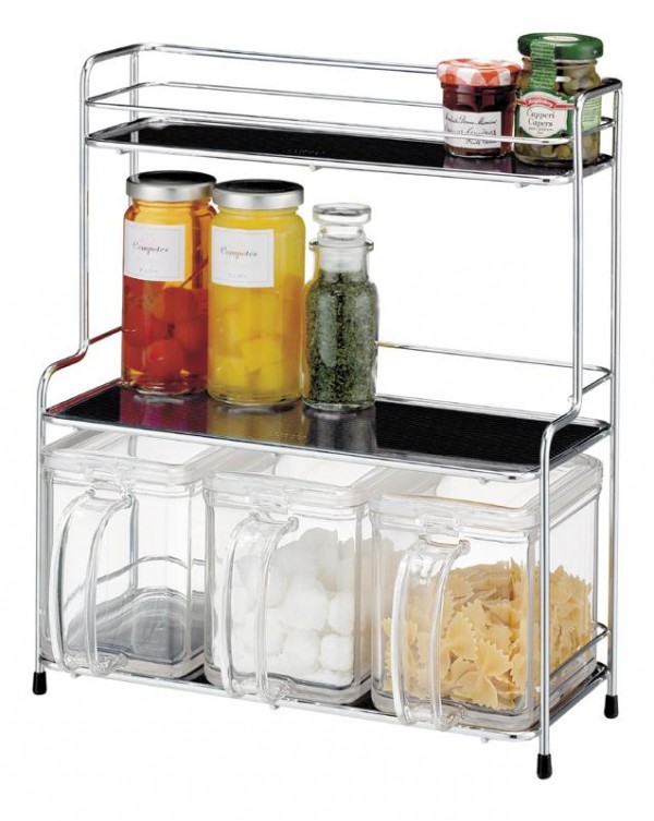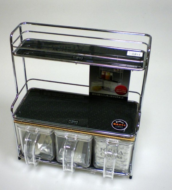 スタイリッシュな調味料入れ&3段ラックです。ポットの蓋は湿気を防ぐパッキン付。上・中・下段の棚には強化ガラスを使用し、汚れがサッと取れて便利です。外観もシンプル&モダンなスタイルです。 |