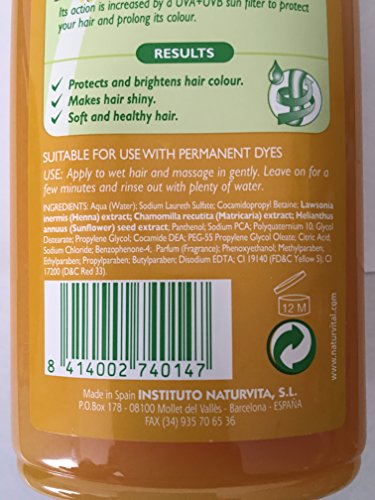 Specially formulated for blonde hair. Contains a mixture of henna and sunflower extracts that revive and protect the colour. Suitable for any type of hair, whether natural or dyed. You will achieve natural colour and shine. Results: Protects and revives the hair colour. Provides shine and brightness. Soft, healthy hair. Henna Henna is a plant with a whitish bark and yellowish white or slightly reddish pink flowers. Henna leaves contain tannins, quinone, flavonoids and lawsone. In cosmetics it is used as a natural hair dye. In addition, its tannin content gives it astringent and strengthening properties for the skin and the hair. Sunflower Plant with a herbaceous stem, heart-shaped leaves and large, yellow flower heads. It contains flavonglucosides, anthocyaninic glucosides, xanthophyll, choline, betaine, sapogenin and chlorogenic acid. In cosmetics, sunflower seed extract is used as it is rich in polyphenols, to protect the colour of natural and dyed hair against the aggression of ultraviolet rays and free radicals.Feature