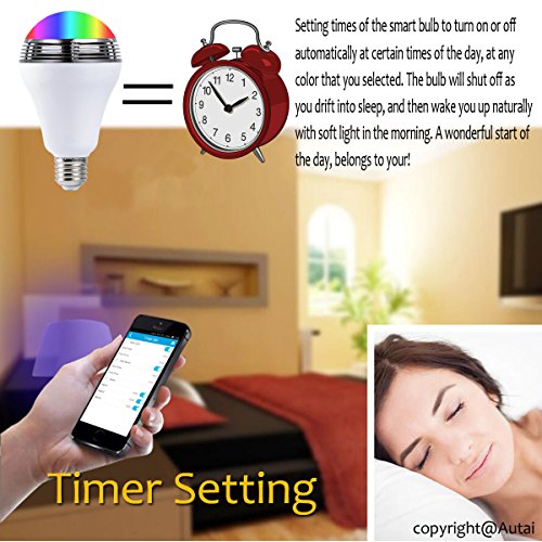 Timer Setting: Setting times of the smart bulb to turn on or off automatically at certain times of the day, at any color that you selected. The bulb will shut off as you drift into sleep, and then wake you up naturally with soft light in the morning. A wonderful start of the day, belongs to your