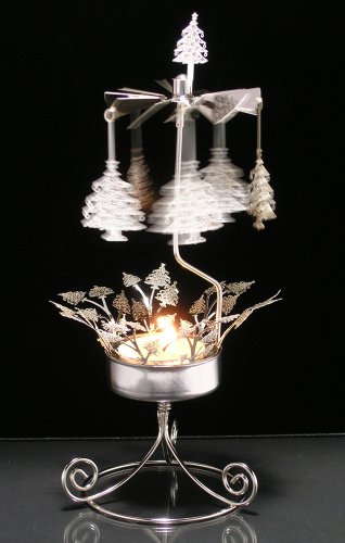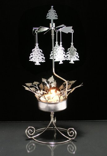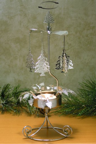 ROTATING CHRISTMAS TREE CANDLE HOLDER. Beautiful silver tea light candle holder with Christmas tree charms. It comes with a bonus tealight candle that when lit, the heat from the candle makes the tress move around. This spinning candle will be the talk of your holiday decor.