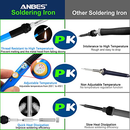 - 【Soldering Iron Unique Features】- Superior professional soldering iron has 5 multiple tips replacement, Heat and impact resistant design of screw thread so the iron head is not easy to drop.Adjustable Temperature from 200℃-450℃.Heat up fast and work great.