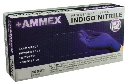 AMMEX Exam Grade Indigo Nitrile Gloves are three times more puncture resistant than latex and more elastic than vinyl. Combining superior comfort and strength with superior tactile sensitivity. These indigido nitrile gloves hold up better against rips and tears than other synthetic gloves. FDA approved for medical use. AMMEX Indigo Nitrile Exam gloves provide excellent durability and barrier protection against bloodborne pathogens and other environmental contaminants. Textured to provide excellent non-slip wet gripping power when handling tools, they are also powder free so they won't interfere with your task. Perfect for medical technicians, tattoo artists, law enforcement and laboratory settings or anywhere a durable nitrile glove with a professional black nitrile appearance is required. Around the home, these black nitrile gloves can be used indoors or outdoors, in the kitchen or garage. Ideal for lawn equipment or car repair and maintenance, cleaning, home maintenance and repairs, painting and plumbing, yard work, personal care, child care, senior care, pet care, arts and crafts. The best indigo nitrile gloves for the price on Amazon prime. Disposable and limited-use gloves are used in medical, forensic, scientific, food service and industrial applications. Disposable gloves are commonly made from flexible materials such as latex, nitrile, chloroprene and vinyl. While most disposable gloves are designed for use on either hand, some can be purchased in hand-specific models. They are offered powdered or powder-free; silicone or silicone-free; chlorinated or non-chlorinated; coated or uncoated; with a standard- or extended-length cuff; sterile or non-sterile; and with textured or smooth fingers, fingertips and palms. Chemical resistance means the glove helps protect the hand from certain chemicals and varies by glove material. For information on the chemical resistance of this glove, consult the Ammex chemical resistance guide. Ammex distributes medical and industrial products such as gloves, first aid supplies, face masks and other protective coverings. The company, founded in 1988, is headquartered in Kent, WA. 0 |