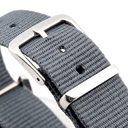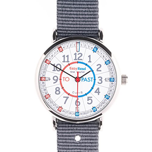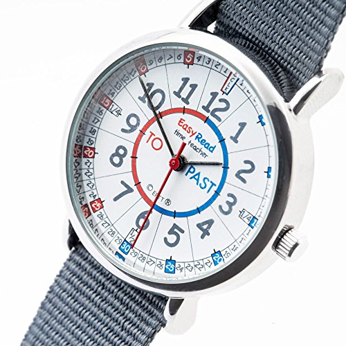 EasyRead Time Teacher children's watch, 1.3" diameter, with red, blue & grey face, slate grey fabric strap and metal buckle.