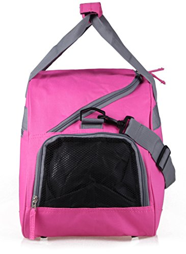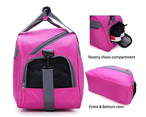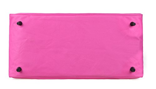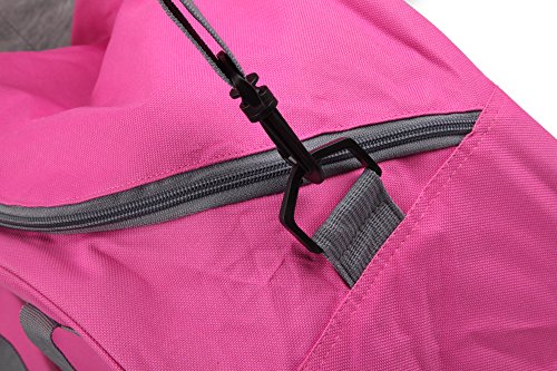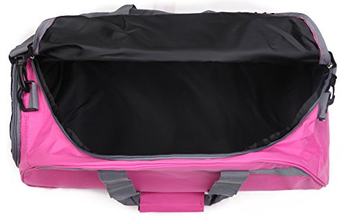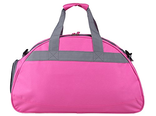 Product Description This stylish gym bag is made from sturdy 600D polyester. See images above. It's lightweight and features wide handle straps that lock together with a Velcro strip so it's comfortable to transport and doesn't add any weight to your gear. It has a zippered shoe compartment at one end so you can tuck away your sneakers or shoes conveniently. Zippered pocket outside and another zippered pocket inside for extras like wireless earplugs or temporary storage for keys and wallet. The bag is large enough for all your cross fit gym gear yet small enough to be easy to carry and store. Available hot pink with grey trim. Order yours today!