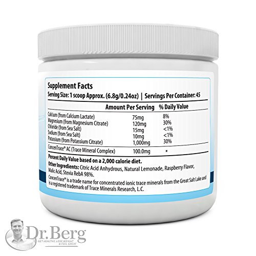 -. Feature : COMPLETE NUTRITION | Dr. Berg's Electrolyte Powder is a complete mineral and trace minerals drink. It's 100% dissolvable and has an amazing taste (raspberry lemon) with a hint of stevia. / 100% SATISFACTION GUARANTEED | With over 25 years of experiencing assisting over 45,000 patients in achieving healthy weight loss, Dr. Berg has created a line of products that support his message of 'getting healthy to lose weight, not losing weight to get healthy.' If for any reason you are not happy with the results you experience within the first 30 days of taking the Electrolyte Powder, we're happy to give you a full refund! Just send us a message on Amazon. / HYDRATE | Electrolytes are needed for cellular energy, muscle and nerve function. This drink will help you replenish and rejuvenate your cellular energy and be hydrated. / POTASSIUM RICH | This complete and balanced, soluble electrolytes give 1000 mg of potassium per serving size. This is higher that any electrolyte powder on the market. Our bodies need 4,700 mg of potassium citrate each day and many people only get a fraction of this in their diet. You'll also get the other electrolytes in the perfect balance. / NO ADDITIVES | Unfortunately most electrolyte powder mixes contain the filler and highly glycemic maltodextrin. We made sure avoid adding maltodextrin or sugar to our formula.