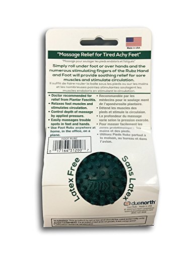 Studio : Due North Publisher : Due North Product Description The Due North Foot Rubz massage ball stimulates acupressure points in your feet, hands and body, helping to relieve soreness and pain. It can even provide temporary relief from plantar faciitis. Roll this uniquely designed ball under your feet, in your hands or over any sore or tired muscle and feel the soothing stimulation that immediately begins to relax and eliminate your tension. You control the depth of massage with applied pressure to ensure the utmost relief of muscle soreness. Small enough to fit in the palm of the hand, this easy-to-use massage ball is great for use anytime, anywhere. Based on ancient Asian accupressure techniques, this little ball massages trouble spots on hands and feet. 0