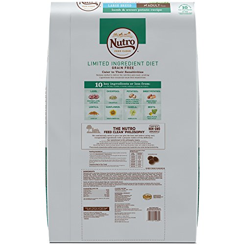Crafted for Large Breed dogs, NUTRO Limited Ingredient Diet Large Breed Adult Lamb & Sweet Potato Recipe Dog Food is made using 10 key ingredients or less plus natural flavors, vitamins minerals and other nutrients. These dry dog food recipes avoid ingredients that commonly cause food sensitivities in pets, like chicken, beef, corn, wheat, soy and dairy protein. Prepared with high-quality Australian and New Zealand lamb and real sweet potatoes, this grain-free dog food not only tastes great, but it also nourishes sensitive skin for a soft and shiny coat –– guaranteed or your money back. NUTRO Limited Ingredient Diet Food for Dogs also follows the NUTRO FEED CLEAN philosophy, is always made with Non-GMO* Ingredients and is made with no artificial flavors, colors or preservatives. * Trace amounts of genetically modified material might be present due to potential cross contact during manufacturing.Feature