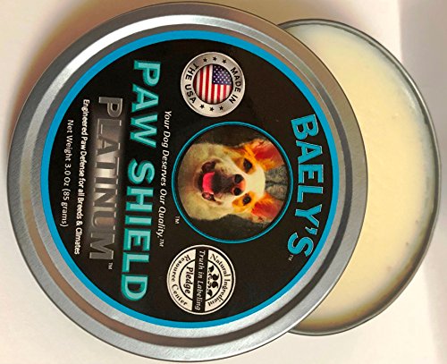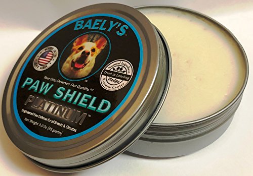 Baely's Brand Paw Shield Platinum Formula is an ultra-premium blend of all natural ingredients engineered to provide the most protection for your dog's paws on the market. Our proprietary blend of all natural ingredients has been custom-formulated using non-toxic, human-grade, high-performance hydrophobic materials that deliver superior protection for your dog's paws with no harmful or chemically derived components. Use this in combination with Baely's Brand Daily Defense Nose Paw and Skin Protectant to repair dry, cracked and painful paws with all natural, fully edible ingredients. Baely's Paw Shield is the highest quality protection available for your dog's paws, nose or any exposed skin. Our standard size is 3 ounces, which is 50% more than most competitors. Baely's is packaged in all metal tins for robust and long-term storage.Feature