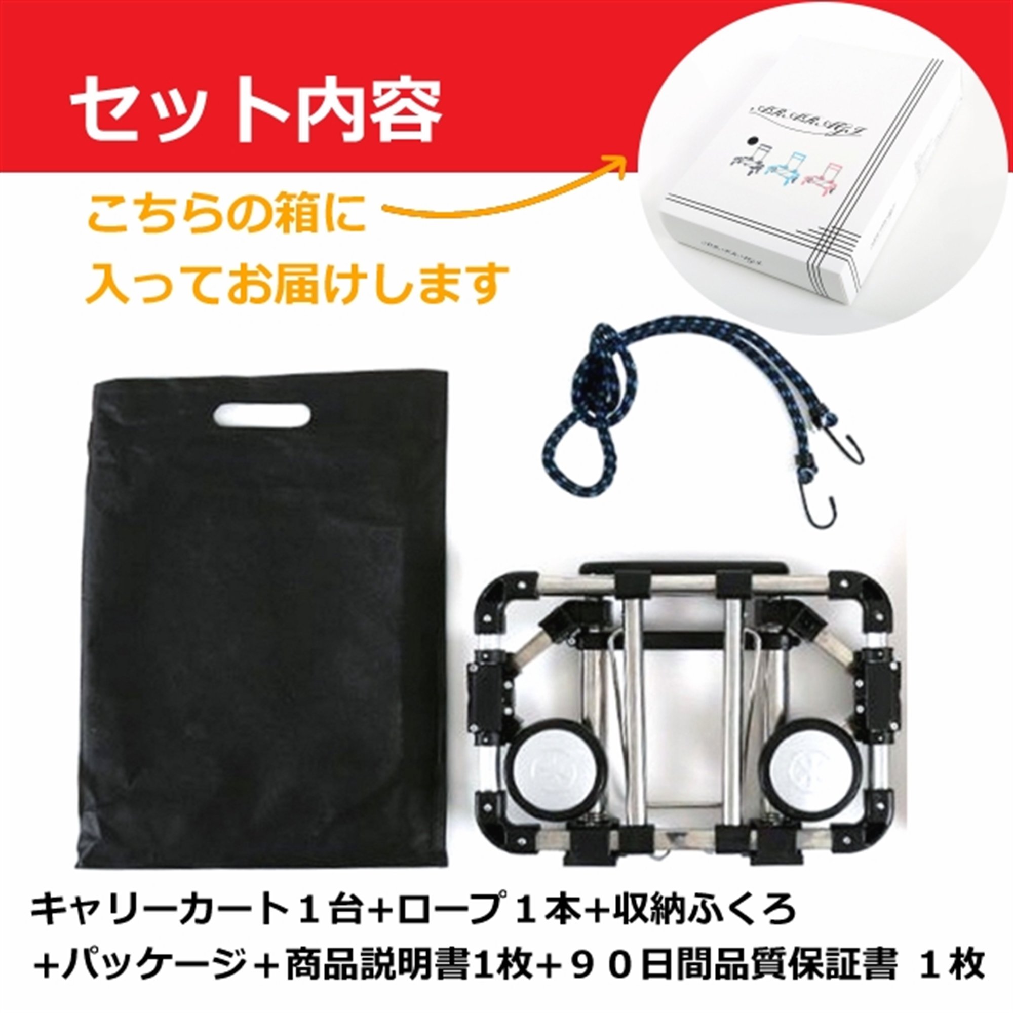 Includes: Carry cart + 1 rope + storage bag + package + item description (this document) 1 sheet + 90 days quality warranty card 1