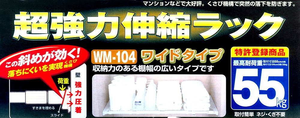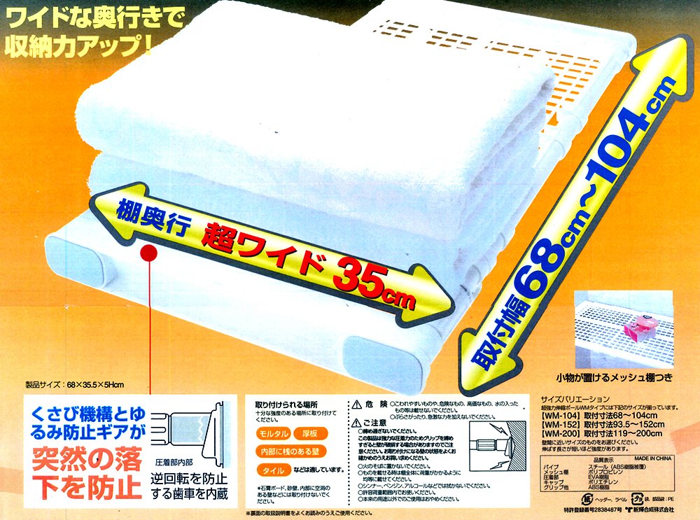 Strong expansion / contraction rack that can accommodate a wide range of installation range 68 cm - 104 cm, shelf width 35 cm