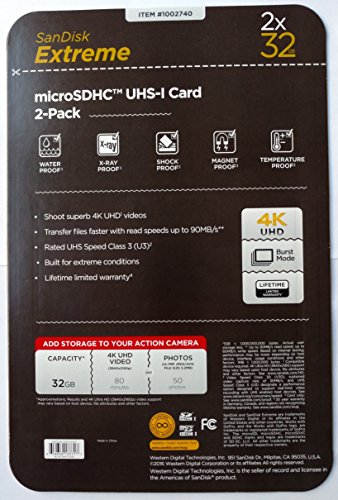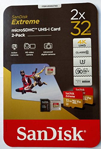 Product Description SanDisk Extreme 32GB microSDHC Class 10 UHS-I Memory Card with SD Adapter, U3, V30, Up to 90MB/s read speed and up to 60MB/s write speed - 2 microSDHC cards per packet 0