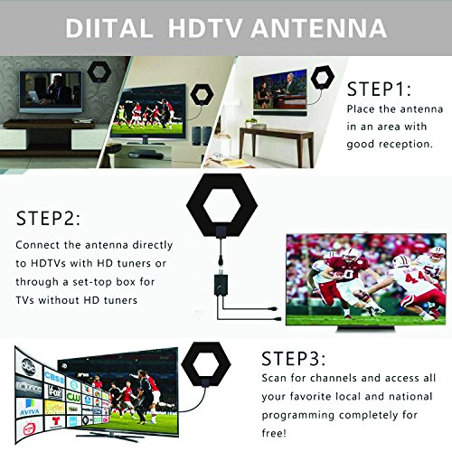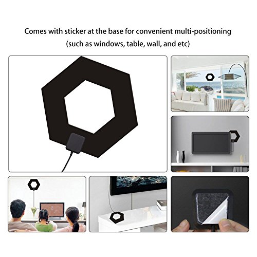 Sure Grip - Elegant Regular Hexagon Hollow Design - can receive Omni-directional tv signal; you can hung antenna on the back of TV or from any hook by the hollow design; or stand it on table by included Antenna-Stand, or stick on wall or window by 3M stickers; Sure Grip guarantees the easiest installation of any indoor antenna; grips to walls and windows. It's perfect for dorm rooms or take it on-the-go