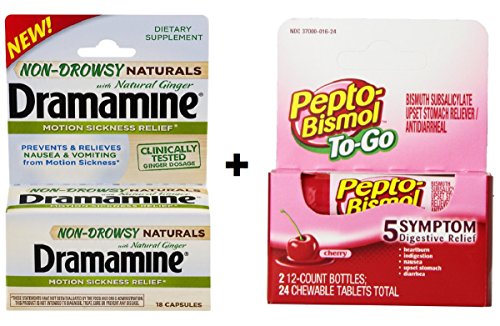 -. Feature : Contains 1 x 24 Count Pepto To Go Tablets PLUS 1 x 18 Count Caps Dramamine Non Drowsy Naturals / Great Combo For those road trips or your daily commute!