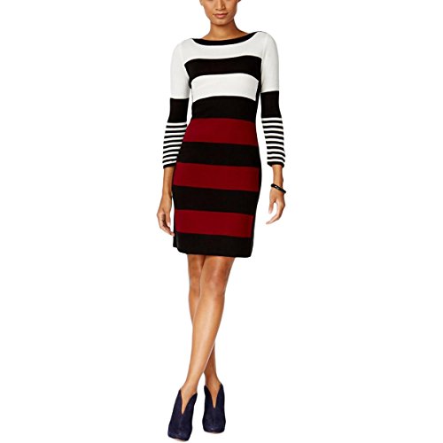 Product Description3/4 sleeve bold color block stripe sweater dress with smaller stripe detailing along sleeves0