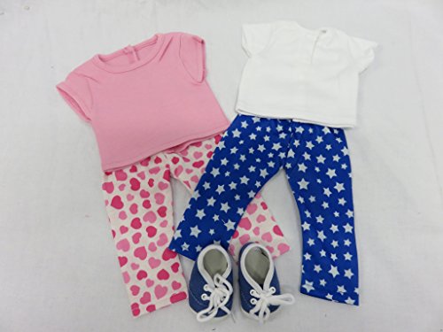 -. Feature : Two pair of leggings, pink heart leggings and white stars leggings / Pink and white cap sleeve shirts / Denim sneakers / Fits 18 inch doll / Free Shipping