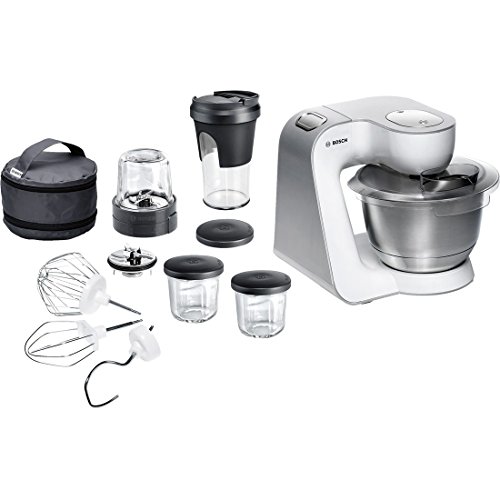 -. Feature : Extra starker Motor (900Watt) für anspruchsvolle Teige und schnelle Verarbeitung / Vielseitig einsetzbar mit Patisserie-Set (Schlagbesen, Rührbesen, Knethaken) und kompaktem Multi-Zerkleinerer-Set mit 5 Funktionen: Mühle, Universalzerkleinerer, Mixer sowie praktische Aufbewahrungs- und ToGo-Lösung. / Große Rührschüssel aus Edelstahl (max. Teigmenge 2,0 kg) und 7 Arbeitsstufen plus starker Momentstufe für grenzenlosen Backspaß / Easy Arm Lift: Einfache und kraftsparende Ein-Knopf-Bedienung des multifunktionalen Rührarms mit 3 Antriebsstellen / Einfach und sicher zu bedienen (Bosch Technik); leicht zu reinigen (Spülmaschinen geeignetes Zubehör) / Lieferumfang: 1 x Rühr-/Schlagbesen, 1 x Deckel, 1 x Edelstahl-Rührschüssel, 1 x Knethaken Metall, 1 x Zubehörtasche dunkelgrau, 2 x Messer-Schutzkappe, 3 x Glas mit Aufbewahrungsdeckel, 1 x ToGo Mix-/Trinkbecher, 1 x Hack-/Mixmesser, 1 x Mahlmesser
