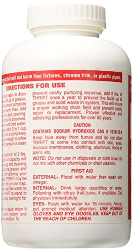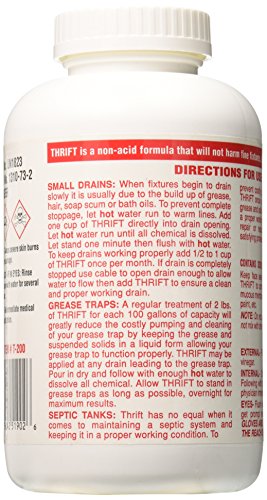 -. Binding : Kitchen -. Brand : Thrift -. Department : unisex-adult -. EAN : 0719242519026 -. Feature : This product is highly durable / This product adds a great value / This product is manufactured in United states / THRIFT works on drains, sewer lines, grease traps, and septic systems. / THRIFT will clean out a drain line in less than 60 seconds! / THRIFT is safe to use on most kitchen or lavatory surfaces. -. IsAutographed : 0 -. Label : Thrift -. Manufacturer : Thrift -. Model : GIDDS-TY-0400879 -. MPN : GIDDS-TY-0400879 -. NumberOfItems : 1 -. PackageQuantity : 1 -. PartNumber : GIDDS-TY-0400879 -. ProductGroup : Home -. ProductTypeName : HOME -. Publisher : Thrift -. Size : 2 lb. -. Studio : Thrift -. Title : THRIFT MARKETING GIDDS-TY-0400879 Drain Cleaner 2 lb -. UPC : 787543873413