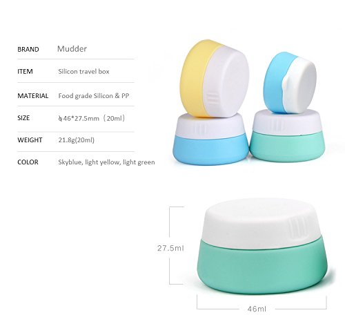 -. Brand : Mudder -. EAN : 0713072668725 -. Feature : Travel containers material: silicone, BPA free; FDA (USA) and LFGB (Germany) approved / Silicone cosmetic containers are convenient to store lotions, cream, shampoo, powder, condiments, etc. / Quantity: 3 pieces; Space saving and easy to carry / Anti-drip flip cap can prevent leak and spill; Carry-on approved and travel-friendly / You can easily clean these silicone makeup containers by soaking them in warm soapy water or using the dishwasher -. IsAdultProduct : 0 -. Label : Mudder -. Manufacturer : Mudder -. MPN : Mudder-cosmetic containers-01 -. PartNumber : Mudder-cosmetic containers-01 -. ProductGroup : Beauty -. ProductTypeName : LAGE -. Publisher : Mudder -. Studio : Mudder -. Title : Mudder Silicone Cosmetic Containers Cream Jar with Sealed Lids (20 ml, 3 Pieces) -. UPC : 713072668725