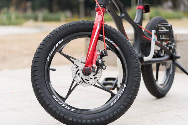 ●個性的なエグりが入った形状のトップチューブ、手裏剣のようなホイール、光沢のある合金製ブレーキレバーなど、お子様の興味を惹くに十分なデザインです。