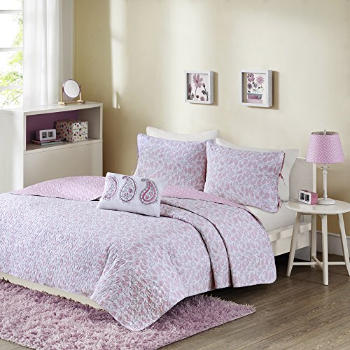 Product Description Add a pop of fun to your bedroom with this Coverlet Set. Softer shades of pink and grey brighten up this fun paisley design with intricate heart details inside. A pink and white polka dot reverse makes for the perfect combination in this collection. 0