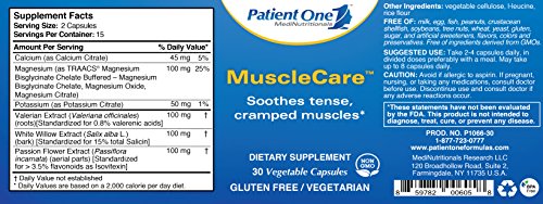 -. Binding : Health and Beauty -. Brand : Patient One -. EAN : 0859782006058 -. Feature : Electrolytes and soothing herbs to help relieve nighttime leg cramps, minor muscle cramps from exercise and general muscle tension / Helps relax muscles tense from daily stress / Soothes muscles overworked by athletic activity / Promotes relaxation for a good night's sleep / Supports balanced electrolytes -. IsAdultProduct : 0 -. Label : MediNutritionals Research LLC -. LegalDisclaimer : These statements have not been evaluated by the FDA. This product is not intended to diagnose, treat, cure, or prevent any disease. -. Manufacturer : MediNutritionals Research LLC -. ProductGroup : Health and Beauty -. ProductTypeName : HEALTH_PERSONAL_CARE -. Publisher : MediNutritionals Research LLC -. Studio : MediNutritionals Research LLC -. Title : Patient One MuscleCare Travel Size - 30 Vegetable Capsules -. UPC : 859782006058
