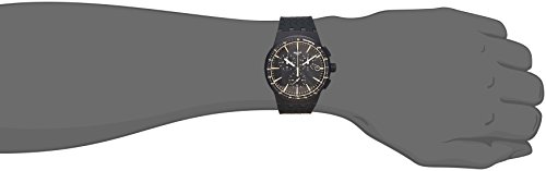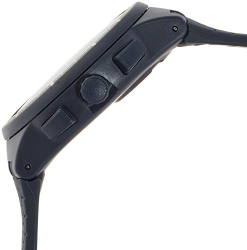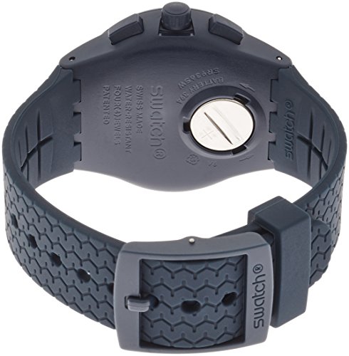 Navy plastic case with a navy blue silicone strap. Fixed navy plastic bezel showing tachymeter markings. Navy dial with silver-tone hands and index hour markers. Minute markers. Dial Type: Analog. Luminescent hands and markers. Date display at the 3 o'clock position. Chronograph - three sub-dials displaying: 60 second, 60 minute and 1/10th of a second. Quartz movement. Scratch resistant mineral crystal. Pull / push crown. Solid case back. Case diameter: 42 mm. Case thickness: 14 mm. Round case shape. Band width: 20 mm. Tang clasp. Water resistant at 30 meters / 100 feet. Functions: chronograph, date, hour, minute, second. Casual watch style. Watch label: Swiss Made. Swatch Meine Spur Navy Dial Navy Blue Silicone Unisex Watch SUSN407.Feature