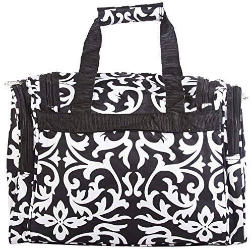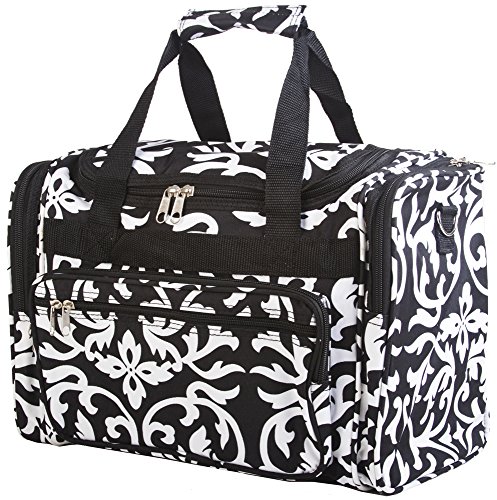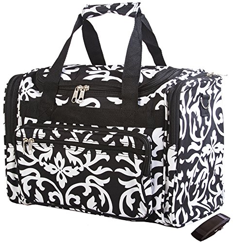 -. Brand : World Traveler -. ClothingSize : 16-inch -. Color : Black/White -. Department : womens -. EAN : 0763598183967 -. Feature : Adjustable, detachable non-slip padded shoulder strap / U-top opening provides easy access to roomy zipper secured main compartment / Metal feet allows stabiity to bag when setting down and provides bag floor not to touch floor directly to get dirty / Front exterior zip pocket with two exterior end zip pockets / Silver pewter hardware -. Model : T16-501-B -. MPN : T16-501-B -. NumberOfItems : 1 -. PackageQuantity : 1 -. PartNumber : T16-501-B -. ProductGroup : Apparel -. ProductTypeName : LAGE -. Size : 16-inch -. Title : World Traveler Black Floral Damask Duffle Bag 16-inch -. UPC : 763598183967