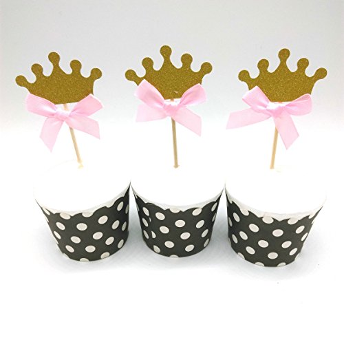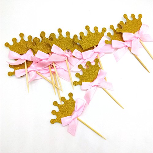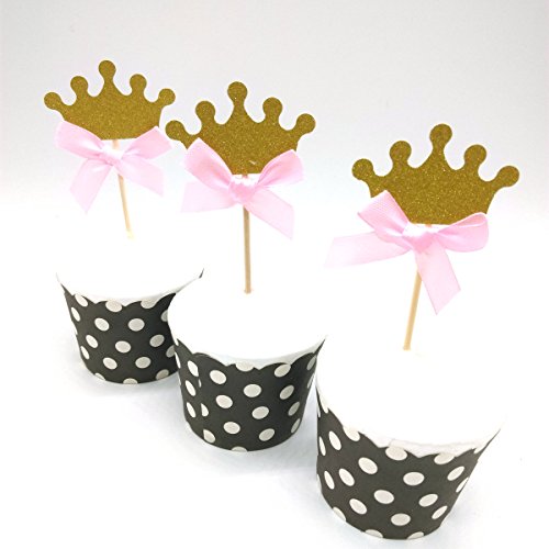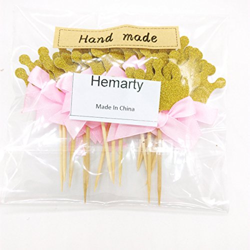 Heamarty 16 Pink Bow & Gold Glitter Crown Cupcake Toppers Crown Cupcake Toppers, Birthday Cupcake Topper, First Birthday Cupcake Toppers