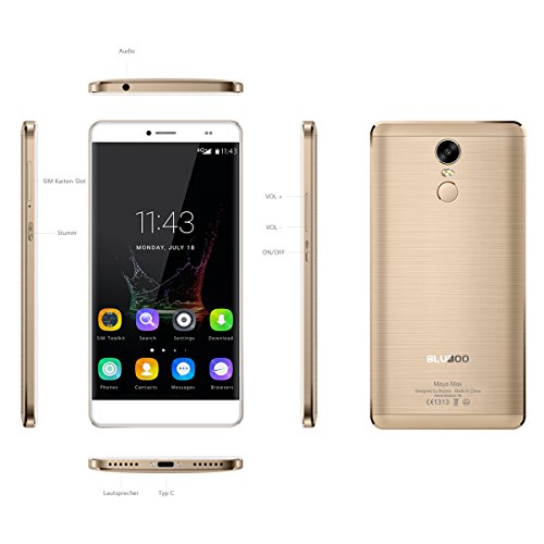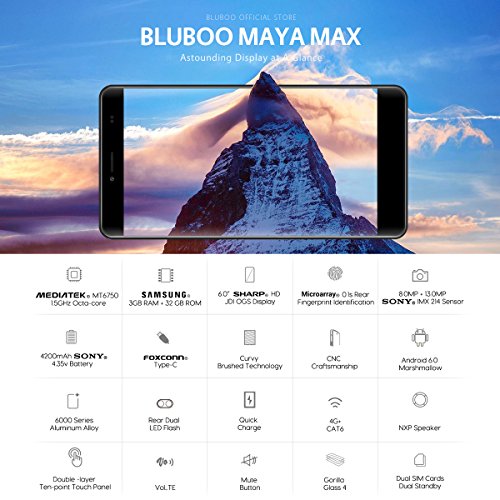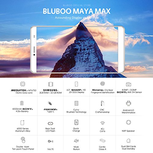 BLUBOO Maya Max 4G Smartphone Android 6.0 6.0 Zoll HD MTK6750 Octa Kern 1.5 GHz, 3GB RAM 32GB ROM, 13.0MP + 8.0MP Sony Kamera, 4200mAh Akku, Fingerabdrucksensor