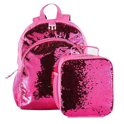 -. Feature : 2 Piece Set Includes (1) Full Size Backpack, (1) Matching Lunch Box Bag / It's like Magic! Brush the Sequins in one direction for a Pink Backpack, Brush them in the Opposite direction, and the Sequins Flip, revealing the Silver Side. Make Patterns for different designs and looks. / Backpack Measures 16.25" x 12.375" x 5.25". Features Zipper Main Compartment, Zipper Front Compartment, 2 Side Mesh Pockets, Padded and adjustable Straps, Padded Back for Comfort / Lunch Bag Measures 9" X 8" X 4". Features Soft Carry Handle, Double Zip Closure, Fully Insulated Interior / Wipe Clean