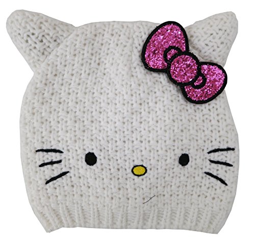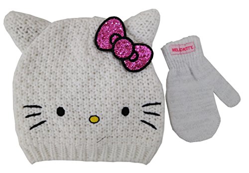 Binding : Apparel Product Description Bring your favorite characters with you to keep you comfortable and looking great in the cold Weathers ! With Sanrio Hello Kitty White knitted Beanie Hat and Mitten Set, On Your Hands and Head To Keep You Warm. You Can't Go Wrong With This Unique Designed Accessory Set. Hello Kitty Is A Funny Animal Cartoon Character Hat Featuring:Pink Fucsia Glitter Bow Near Top Ear design White Mitten: silver sparkle Hello Kitty Printed On edging , Officially Sanrio Licensed Product, One Size Fits Most Kids, 0